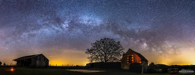 En utilisant un temps de pose plus court (quelques secondes, pas plus de 30, au delà le mouvement des étoiles devient visible) mais un réglage en ISO plus élevé, toujours avec une objectif de focale standard (entre 18 et 55mm par exemple) vous obtiendrez de jolis panoramas. Pour obtenir de meilleurs résultats, il est préférable de prendre au moins 5 photos identiques dans la foulée avec un déclencheur souple, une télécommande ou un retardateur et d'utiliser un logiciel gratuit tels que SIRIL pour empiler les photos, supprimer le bruit et améliorer le contraste.