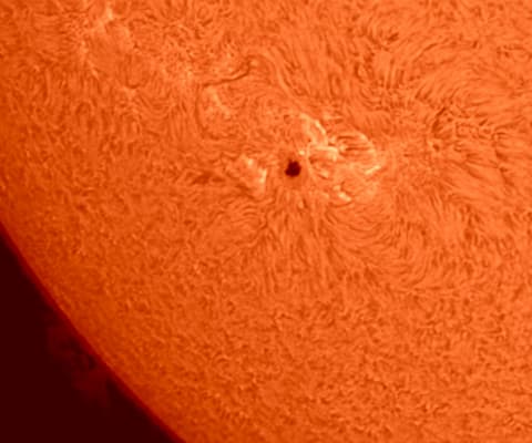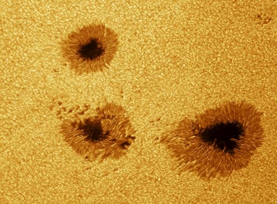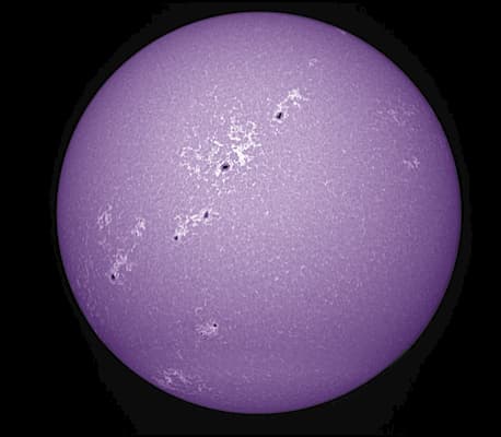 Il suffit alors de reprendre l'une des configurations décrites dans la section imagerie planétaire et d'associer ce filtre avant de faire un film avec le plus d'images possible et de les traiter. La tâche peut être ardue, car la mise au point est compliquée et l'image est extrêmement turbulente. Ce qui implique que vous aurez un important rejet d'images dans votre film, d'où la nécessité d'en faire un suffisamment long. Cette technique permet à moindre coût d'étudier les tâches solaires et leur évolution sur notre étoile.
